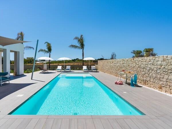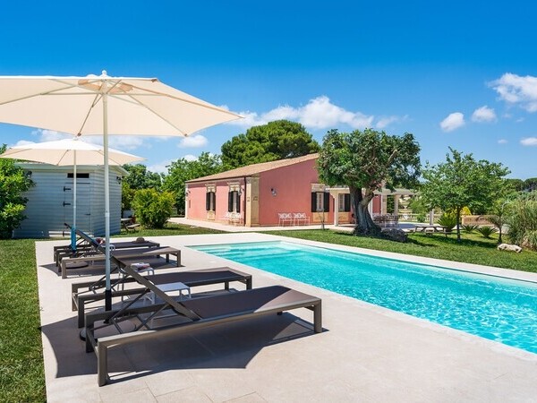 Genießen Sie Villa Mia, ein luxuriöses Ferienhaus mit privatem Pool und mediterranem Garten in der Nähe von Marzamemi und San Lorenzo Strand, ideal für erholsame Tage.