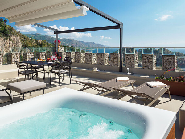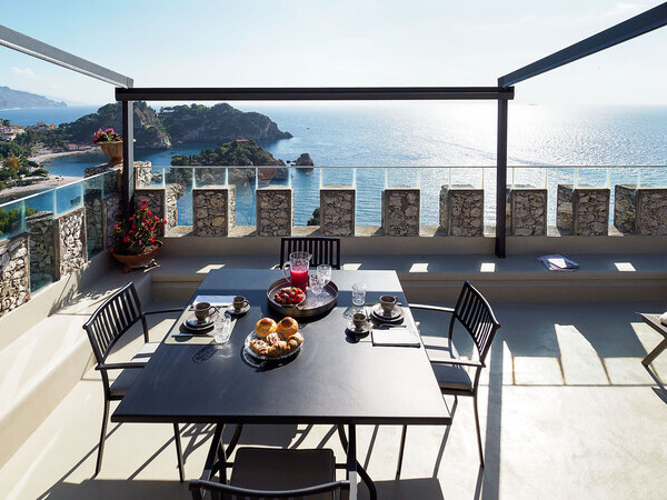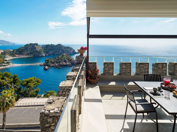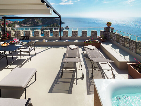Genießen Sie Luxus pur in der exklusiven Wohnung Torre Isola Bella in Taormina – mit traumhaftem Meerblick, privatem Dachterrassen-Jacuzzi und direktem Zugang zum Strand und ins historische Zentrum.