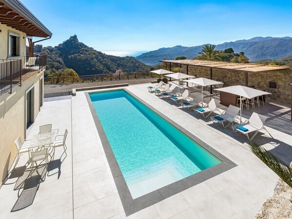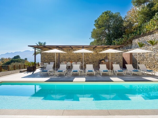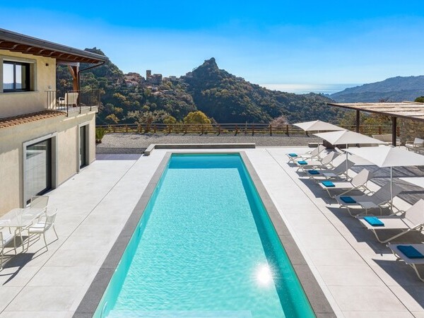 Entdecken Sie die Villa Zagara Bianca in Savoca mit großem Pool und Panoramablick auf den Ätna, ideal für einen luxuriösen Urlaub nahe Taormina.
