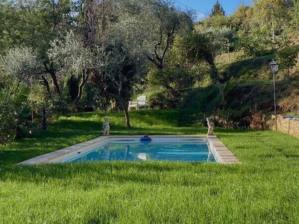 Entdecken Sie die historische Villa Spenser nahe den Cinque Terre, mit privatem Pool, großem Garten, modernem Komfort und atemberaubendem Blick auf den Golfo dei Poeti und die Apuanischen Alpen.