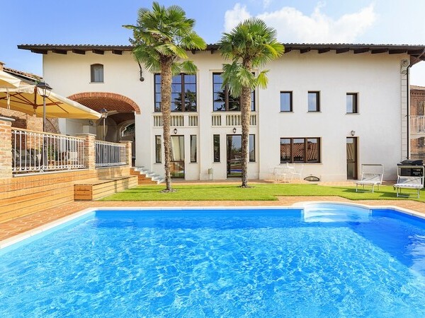Villa Rosilda im Piemont: stilvolle Villa mit Blick auf Weinberge & Alpen, großem Garten mit Kastanien, Pool & Außenbereich mit Grill und Esstisch.