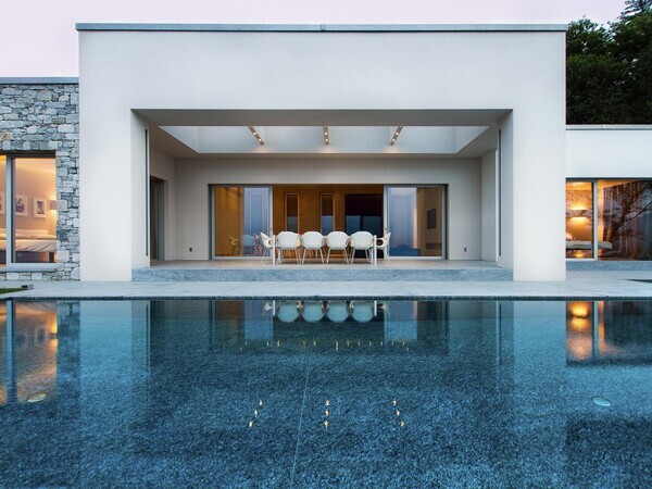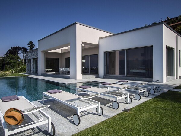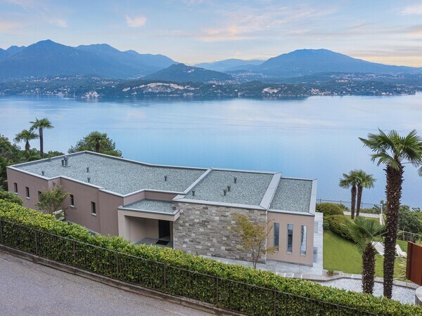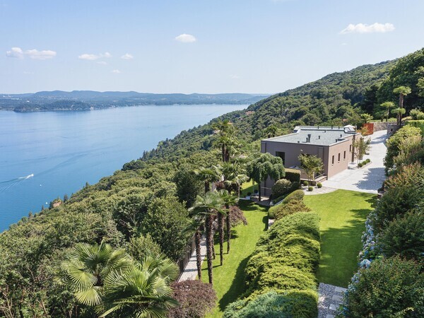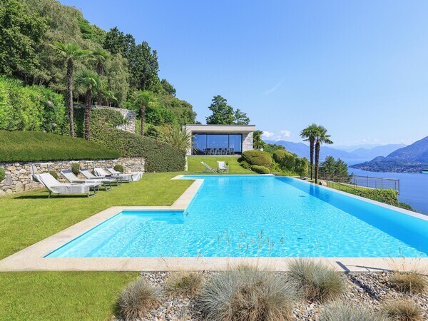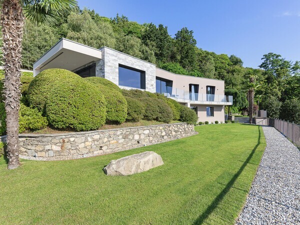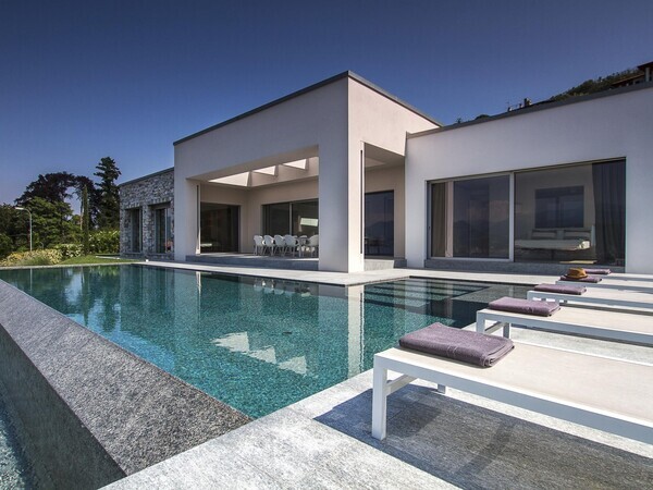 Luxusvilla am Lago Maggiore mit Infinity-Pool und Seeblick. Moderne Architektur, helle Räume, mediterraner Garten – stilvolles Ferienhaus in ruhiger Lage.